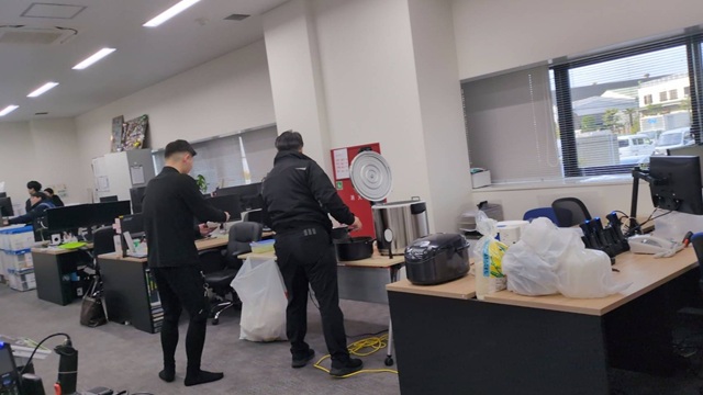業務スペースのすぐ横に鎮座する巨大な寸胴と炊飯器。このシュールな光景こそが、我が社の日常です。