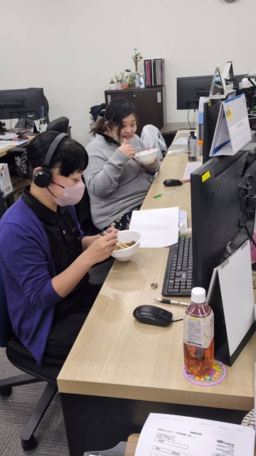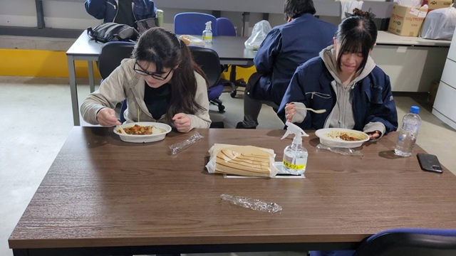本当はみんなで一つの大きなテーブルを囲んで食べたいのですが、そこはプロの物流マン。